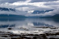 Fjordenlandschap op IJsland met bergen, water, lucht. De laaghangende bewolking hangt als het ware om de berg, boven het fjord. De bergen en lucht worden weerspiegeld in het water.