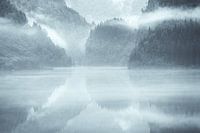 Laaghangende bewolking en mist liggen over een fjord in Noorwegen. De dennenbossen op de hellingen van de bergen dampen van de recent gevallen regen. Er hangt een mystieke en kalme sfeer over het landschap.