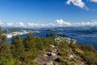 Wandelen op Sukkertoppen met uitzicht op het fjordenlandschap bij Alesund in Noorwegen