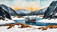 winters fjordenlandschap met kleine trawler - collage