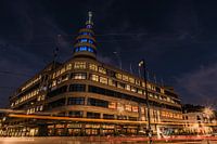 Het iconische Flagey gebouw bij nacht met een voorbijrijdende tram.