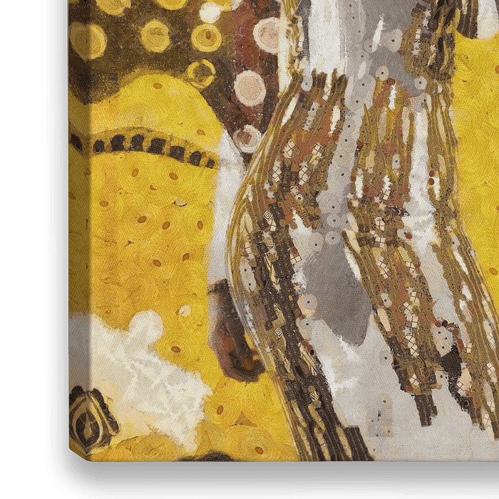 Mixed media collage met in Gustav Klimt stijl geschilderde elementen in voornamelijk okergeel en bruine tinten. Fantasie portret van een vrouw met flair