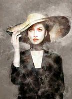 Aquarel portret van een vrouw met grote hoed. Mixed media schilderij in voornamelijk bruin en sepia tinten.