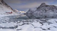 Een verse sneeuwlaag in het Flakstad Fjord in de Lofoten (Noorwegen), de combinatie met het ochtendlicht en de reflecties maakte dat dit ene mooie fotostop was!