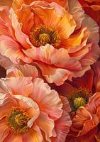 Flame Whispers - Dit bloemenschilderij illustreert een levendige en kleurrijke weergave van klaprozen, met aandacht voor de subtiele overgangen van oranje naar roze en de gedetailleerde weergave van de meeldraden.