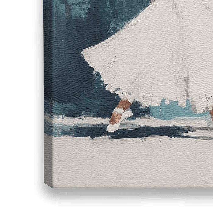 Een elegante danseres in volle beweging, met haar armen wijd uitgespreid, terwijl ze een gracieuze pose aanneemt. Haar witte jurk, die doet denken aan de traditionele Flamenco-kleding, vloeit sierlijk met haar beweging mee, benadrukt door de vurige rode bloem in haar opgestoken haar. De achtergrond van de schildering is een zachte blauwgroene tint, die de dynamiek en de expressiviteit van haar dans versterkt, terwijl de penseelstreken een levendige energie aan het werk toevoegen. Dit schilderij vangt niet alleen de fysieke beweging van de dans, maar ook de emotionele intensiteit en passie die in Flamenco wordt uitgedrukt.
