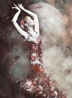 Abstract schilderij in voornamelijk bruin,grijs,bordeauxrood en oranje tinten. Een dansende vrouw in een flamenco jurk met de planeet Jupiter op de achtergrond. Fantasie mixed media met grove penseelstreken,lijnen en druipende verf op canvas