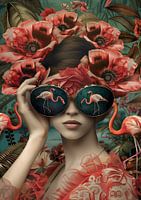 Portret van een vrouw omringd door flamingos en bloemen in dezelfde roodroze kleurstelling. De flamingos zijn ook terug te vinden in haar bril. De verfijnde kleurstelling voert ook terug in haar jurk met mooie tule afwerking. Op de achtergrond de jungle weergegeven door weelderige bladeren op een azuurblauwe achtergond. Zomerse en levendige vibe. Passend bij diverse stijlen en trends, zoals jungle, fantasie, romantisch, modern abstract. Artist: Bianca ter Riet