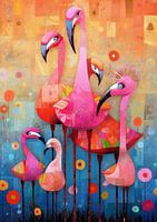 Mixed media illustratie op grof papier met knalroze, blauw en oranje tinten.