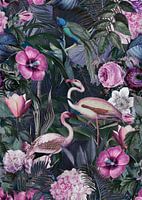 Exotische flamingo's in weelderige vegetatie met bloemen en bladeren