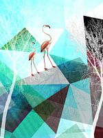 Two flamingos walking through a graphical fantasy landscape, consisting of geometric shapes and tree silhouettes.