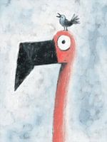 Een schattige roze flamingo steekt zijn lange hals trots omhoog, terwijl een klein vogelvriendje op zijn kop vrolijk meezingt. De zachte pastelachtergrond maakt het beeld rustgevend en vriendelijk voor elk kind. Dit speelse duo brengt een glimlach in de kinderkamer en nodigt uit tot fantasievolle verhalen bij het slapengaan.