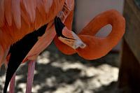Deze flamingo is op 16 augustus 2025 gefotografeerd in het Seaquarium in Curaçao. De felle kleur en lange poten zijn kenmerkend voor deze vogelsoort.