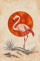 Deze kunstzinnige compositie toont een sierlijke flamingo in een surrealistisch woestijnlandschap, met een stralende rode zon die op de achtergrond oprijst. De gedempte tinten van beige en oranje creëren een warme, vintage sfeer, terwijl de delicate lijnen van de planten en de vogel een gevoel van eenvoud en balans toevoegen. Het werk combineert natuurlijke elementen met abstracte esthetiek en straalt een tijdloze elegantie uit, perfect als decoratie in een boho, Scandinavisch of eclectisch interieur.