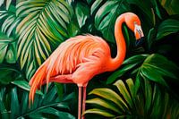 Een felroze flamingo troont tussen weelderige groene bladeren en komt gracieus en elegant tot rust. Zijn zachte strengen veren gloeien letterlijk in de duisternis van de jungle, terwijl het levendige kleurenpalet een exotische sfeer creëert. Deze foto vangt de harmonieuze combinatie van dier en natuur in een fascinerend tropisch paradijs.