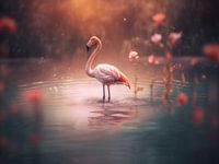 Dit fine art beeld toont een elegante flamingo in een dromerige omgeving. De flamingo staat in het water en het beeld heeft een zachte sfeer door de mooie bokeh en zachte kleuren. De compositie is minimalistisch en trekt de aandacht naar het mooie dier in het midden.