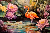 De pracht van een elegante flamingo ontvouwt zich te midden van een kleurrijk paradijs. Zijn heldere verenkleed schittert tegen de achtergrond van glinsterende vijverbloemen en zacht glinsterend water. De harmonieuze combinatie van levendige kleuren en weelderig groen creëert een dromerige sfeer die de kijker meeneemt naar een tropische oase van rust.