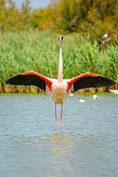 Flamingo of grote flamingo (Phoenicopterus roseus) in de kuststreek van de Camarque in Zuid-Frankrijk tijdens een zomerse dag. De Camarque in de Rhône-delta is een van de weinige Europese habitats voor de grote flamingo.