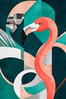 Een levendige flamingo in zachtroze tinten, omringd door geometrische vormen en levendige groene accenten, straalt een gevoel van elegantie en frisheid uit. Dit kunstwerk brengt een vleugje tropische flair in elke woonkamer, terwijl de moderne lijnen en harmonieuze kleuren je uitnodigen om te ontspannen en te blijven hangen.
