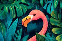 Een levendig flamingoportret in levendige roze en oranje tinten schittert te midden van weelderige groene bladeren. Deze tropische elegantie brengt frisse energie en levensvreugde in elke kamer. Ideaal voor de woonkamer of keuken, het voegt een vleugje exotisme toe aan elke sfeer en nodigt uit tot dagdromen.