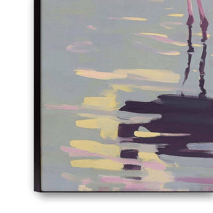 Dit impressionistische schilderij toont een flamingo van opzij, lichtjes naar de kijker gedraaid, staand in ondiep water. Het verenkleed is overwegend roze met zwarte vleugeltips en een zwarte snavel, de dunne poten worden zachtjes weerspiegeld in het blauwgroene water. De achtergrond is een delicaat pastelviolet, met zachte penseelstreken die een kalme, harmonieuze stemming creëren. De losse schilderstijl benadrukt de kleur en vorm van de vogel, terwijl zacht licht en zachte reflecties het tafereel tot leven brengen. De flamingo staat centraal in de compositie en straalt rust en elegantie uit.
