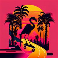 Flamingo rollerskates / skateboard. Straatbeeld met palmbomen en de zon. Vector image. Kleurtinten roze, zwart en geel. Heerlijk zomerse vibe. Pop of colour.