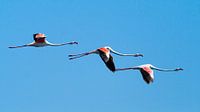 Drie flamingo's in volle vlucht aan de blauwe Afrikaanse lucht.