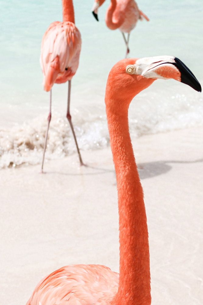 Heerlijke tropische plaat van 3 flamingo's op Renaissance Island bij Aruba.