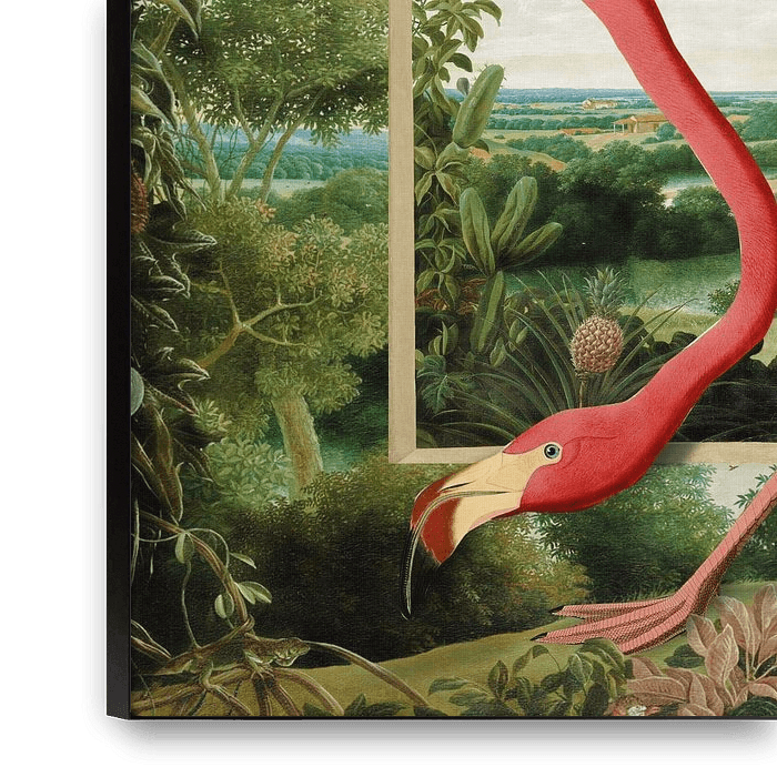 Dit is een collage van afbeeldingen, met een hoofdrol voor de klassieke American Flamingo van John James Audubon. De dieproze vogel steekt prachtig af tegen een weelderig tropisch landschap met palmen en ananassen.