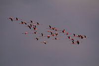 Flamingos bij het Zwillbrocker Venn in vlucht.