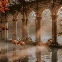 In het weelderige binnenzwembad van een statig Victoriaans huis, omgeven door prachtige ramen in Romaanse stijl, staan twee flamingo's als levende kunstwerken te chillen in het ondiepe waater.