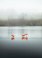 Vier flamingo's slapen in het ondiepe water van een Nederlands natuurreservaat, op een mistige en rustige ochtend.