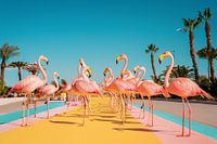 Palm Springs; flamingo's; roze; geel; palmbomen; vogels; kleurig; blauw; lucht; trottoir; Florida; bomen; surrelisme; rijen; kleurrijk