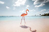 Een flamingo die over het strand op het tropische eiland Aruba loopt. Met het kristalheldere blauwe water op de achtergrond voelt dit strand als een klein paradijs.