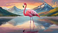 Flamingo staand in een meer met een berglandschap op de achtergrond