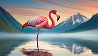 Flamingo staand in een meer met een berglandschap op de achtergrond