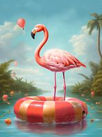 Een vrolijk werk van een mooie flamingo die in een zwemband staat.