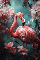 Deze prachtige kunstafbeelding vangt de elegantie van een sierlijke flamingo, omgeven door delicate bloesems in zachte roze en perziktinten. De levendige kleuren van de vogel contrasteren subtiel met de mysterieuze blauwgroene achtergrond, wat een bijna magische sfeer creëert. Dit kunstwerk straalt exotische schoonheid en verfijnde rust uit, perfect voor een stijlvol en modern interieur.