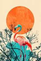 Een stralende zonsondergang in warme, levendige tinten omlijst een majestueuze flamingo die sierlijk tussen gestileerde takken staat. Het harmonieuze kleurenschema en de speelse compositie geven elke kamer een tropische flair. Perfect als blikvanger in de woonkamer of als inspirerend element op kantoor, het creëert meteen een uitnodigende sfeer.