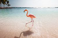 Een flamingo die in de zomer in de kristalheldere blauwe zee op het tropische eiland Aruba loopt.