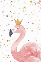 Dit prachtige aquarel schilderij toont een flamingo met een gouden kroon omringd door fonkelende gouden stippen. De majestueuze voorstelling in zachtroze tinten gecombineerd met kostbare gouden accenten geeft het schilderij een koninklijke elegantie. Dit kunstwerk is perfect voor iedereen die op zoek is naar unieke en stijlvolle decoratie en brengt een vleugje luxe en gratie in elke kamer. De fijne details en het glamoureuze kleurenpalet maken het een absolute blikvanger. Ideaal voor woon- of slaapkamers om een exotische en sublieme sfeer te creëren.