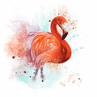 Mooie digitaal met de hand getekende illustratie van Flamingo omgeven door waterverf vlekken en waterverf spetters. In de kleuren oranje, zalm, bruin, roze, wit, zwart en blauw met de suggestie van water en lucht. Komt heel mooi uit als ronde uitsnede!