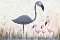 Een wijze blauwgrijze flamingo waakt over haar drie kleine roze kuikens aan de rand van een zacht rietmoeras. De pastelachtige achtergrond en vriendelijke vormen maken dit tafereel perfect voor in de kinderkamer. “Flamingofamilie” brengt een speels en warm familiegevoel, en nodigt kinderen uit om te dromen over gezellige avonturen in het moeras.