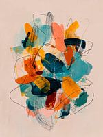 Een abstract schilderij met een mix van levendige kleuren en losse penseelstreken, het kunstwerk kenmerkt zich door een dynamische compositie met overlappende vormen. Dunne grillige zwarte lijnen zijn over het doek geschetst wat een gevoel van beweging en textuur toevoegt, de algehele stijl is expressief.
