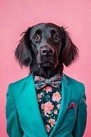 Met zijn charmante uiterlijk en elegante outfit in zachte kleuren straalt deze flatcoated retriever een onmiskenbare persoonlijkheid uit. De glanzende zwarte vacht en vrolijke oren geven hem een jeugdige gratie, terwijl de combinatie van bloemenpatroon en strikje zorgt voor het perfecte vleugje speelsheid. Een echte stijlvolle metgezel!