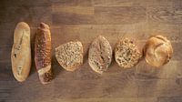 Flat lay van selectie van een verscheidenheid van verschillende broodjes, broodjes en stokken van bakkerij uitgelijnd naast elkaar op houten keukentafel