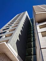 Moderne gevelbekleding aan dit hoogbouw flatgebouw aan Plein 1992 in Maastricht waarbij de schaduw van de balkons zorgt voor extra "spanning".