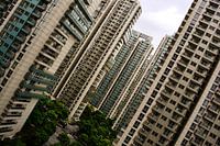 In een centraal gelegen gedeelte in China staan veel dezelfde grote en hogen gebouwen. Vanuit een schuin perspectief genomen.