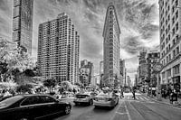 Straatbeeld rond het Flatiron Building in New York City, het herkenningspunt van de stad. Het gebouw staat op Fifth Avenue en is gefotografeerd in zwart-wit.