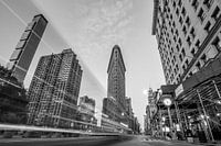 Monochrome opname met lange sluitertijd met op de achtergrond het "flatiron building" in New York.